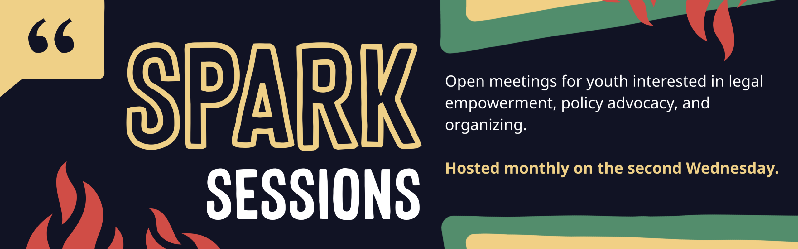 Spark Sessions are a monthly third space for youth (ages 18-24) interested in legal empowerment, policy advocacy, and organizing. Events are hosted monthly on the second Wednesday. Interested in plugging in, but not sure where exactly to begin? Join us at an upcoming Spark Session!